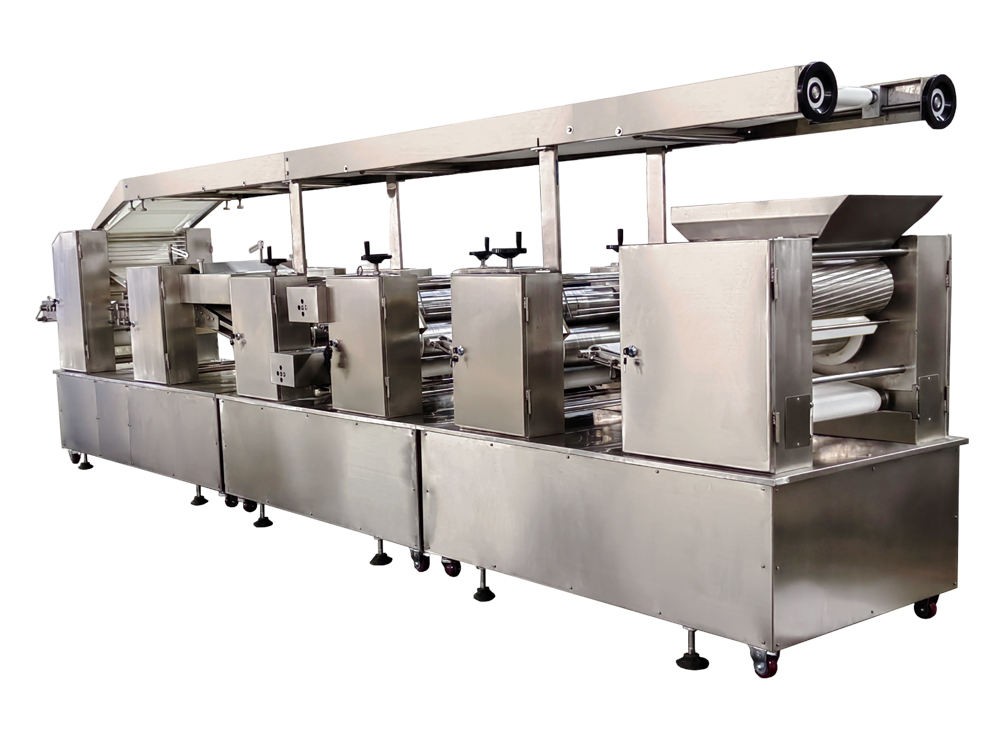 制皮機(jī)為臥式成型機(jī),通過傳送機(jī)構(gòu)將各道軋輥線速度比合理分配,實(shí)現(xiàn)從投料到制皮成型自動(dòng)化生產(chǎn)。適用于餃子皮、餛飩皮、燒麥皮、蒸餃皮、以及燙面類面皮成型。